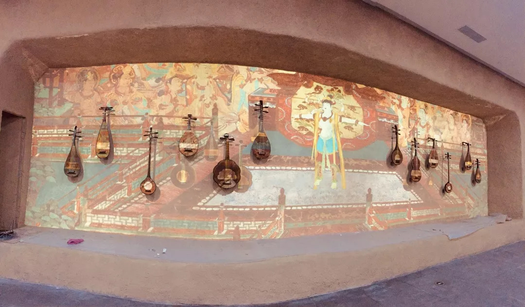 踏進“敦煌樂舞”按照敦煌壁畫原景高度還原的影像投射墻步入眼簾,敦煌特色民族樂器被錯落有致地安排在了墻面兩邊,飛天神女做反彈琵琶的身形,其神態雍容、身姿綽約地穿梭與樂器中,兩者虛實相合、相互映襯。