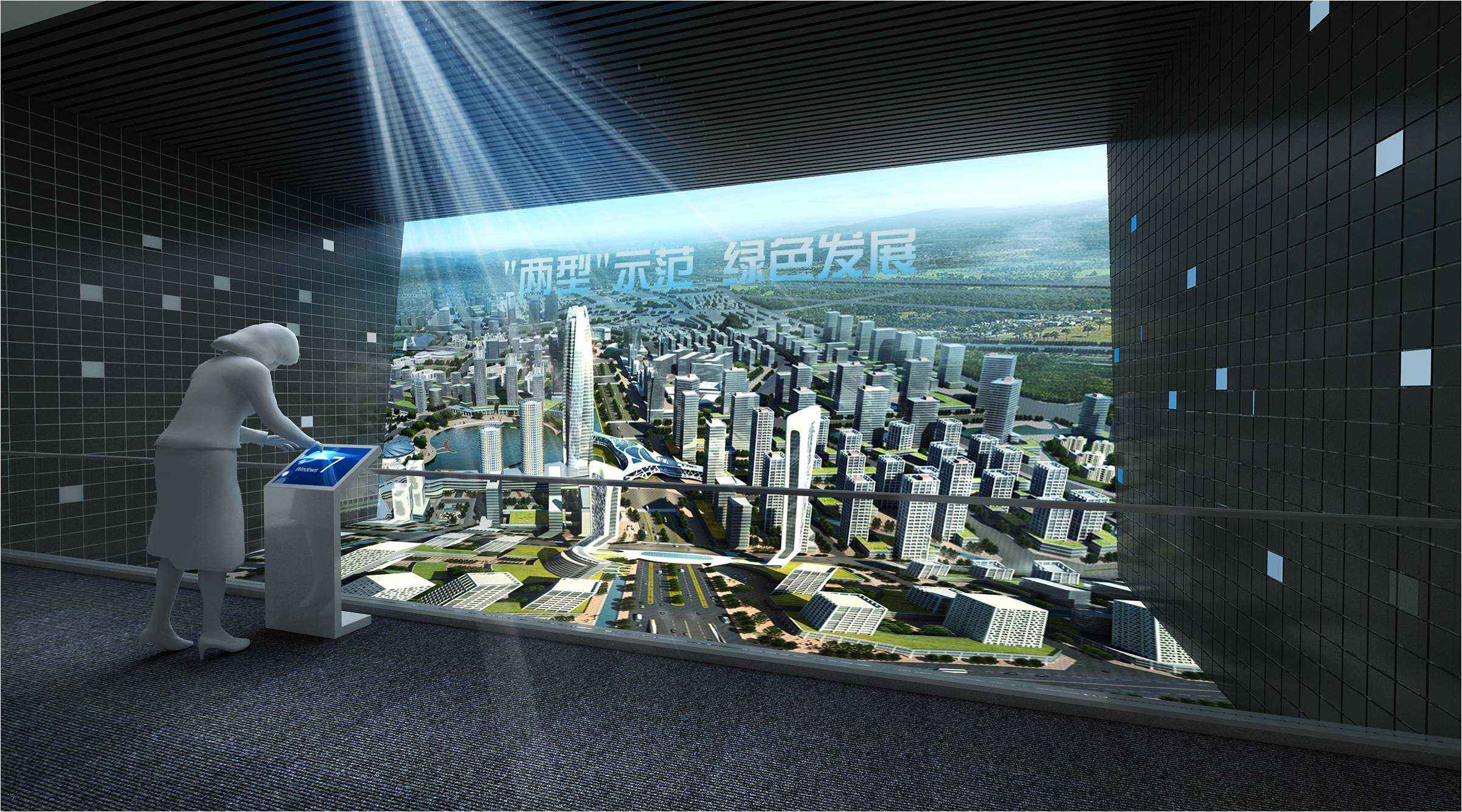 4、將圖像、動(dòng)畫、解說、音樂等多種元素很好的融合在一起,以多媒體解說為主線,使設(shè)計(jì)方案、表現(xiàn)效果圖、三維模擬動(dòng)畫與實(shí)體模型產(chǎn)生相互對(duì)應(yīng),解說到某一建筑,顯示屏上出現(xiàn)本建筑的各種資料,同時(shí)在實(shí)體模型上用燈光來表達(dá)這個(gè)建筑,這將會(huì)給觀眾產(chǎn)生更為深刻的印象。
